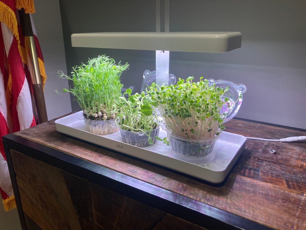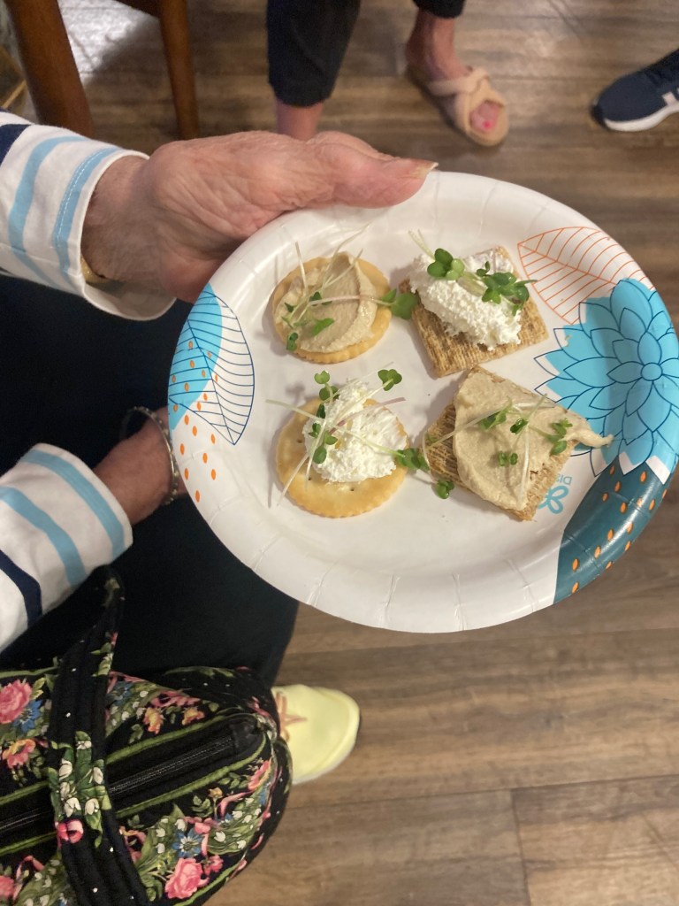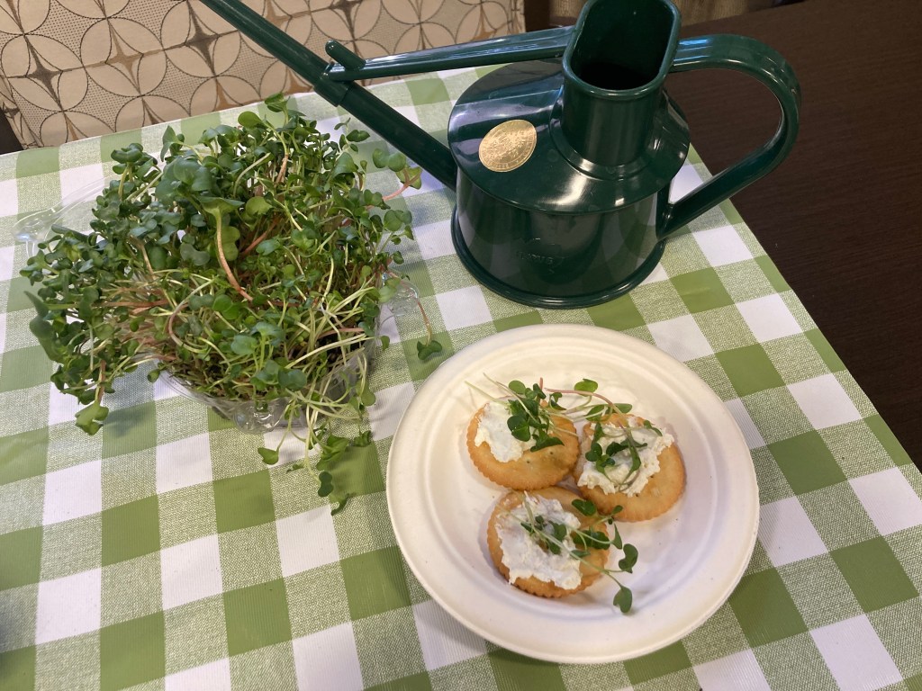 At Belmont Village, the seniors enjoy sprouting microgreens and making delicious snacks. We grow a regular rotation of a “superfood microgreen blend” with broccoli, radish, purple kohlrabi, collard, and turnip sprouts. These sprouts only take two weeks to grow! Then we harvest and place them on crackers with cheese spread or hummus. We’ve also grown cilantro, pea, and sunflower sprouts during the winter. Microgreens grow best when placed under a grow light, so they’re a perfect indoor activity.